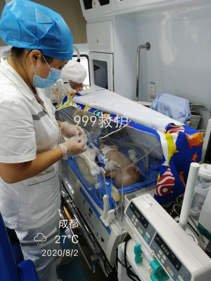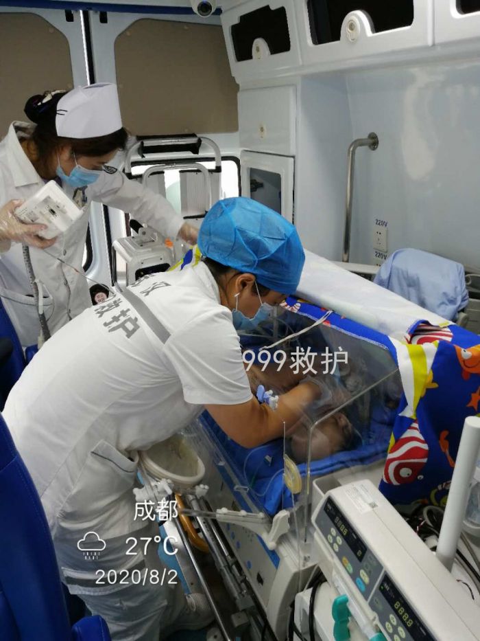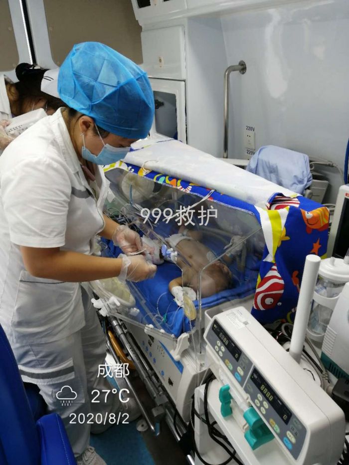 体重3.7千克,先天性软骨发育不良,肺部感染,8月1日晚上我站点救护车出发前往四川成都接转诊38周加2天,患儿46天,需要温箱,插管呼吸机,在我站医护人员的护送下安全到达广州妇幼医院